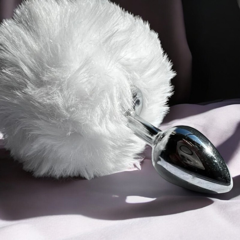 Plug anal em metal, com pompom rosa.