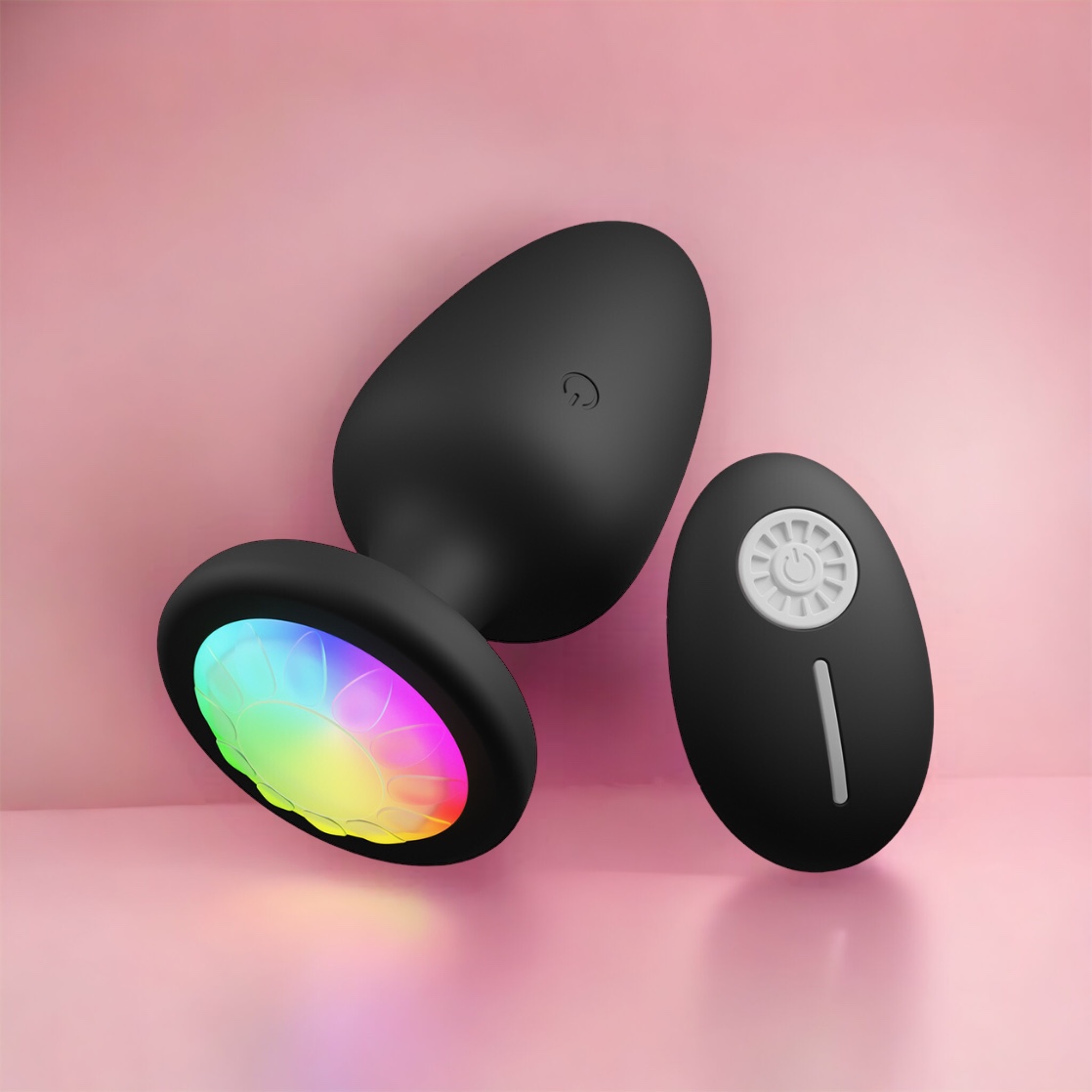 Plug anal vibratório em silicone com base com led e controle remoto. Possui toque suave e aveludado.